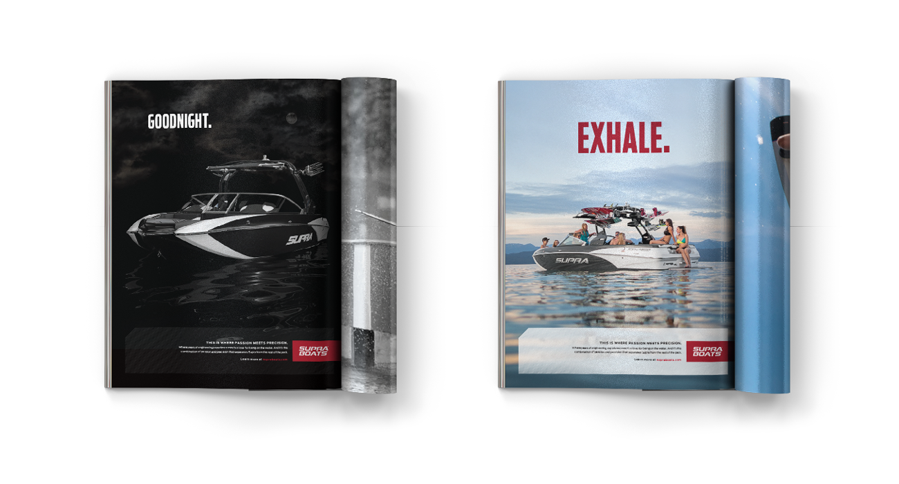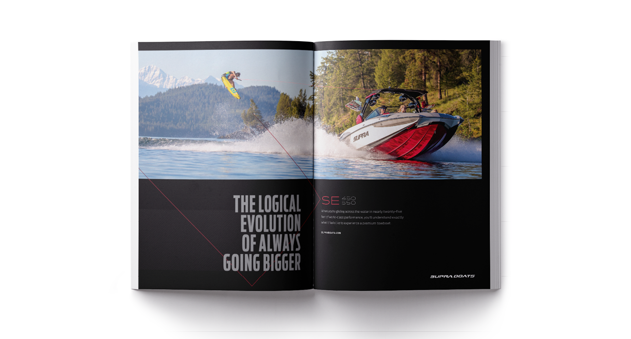 Work done at SixSpeed for Supra Boats. 2017 product brochure, model year campaign concepts, logo explorations.